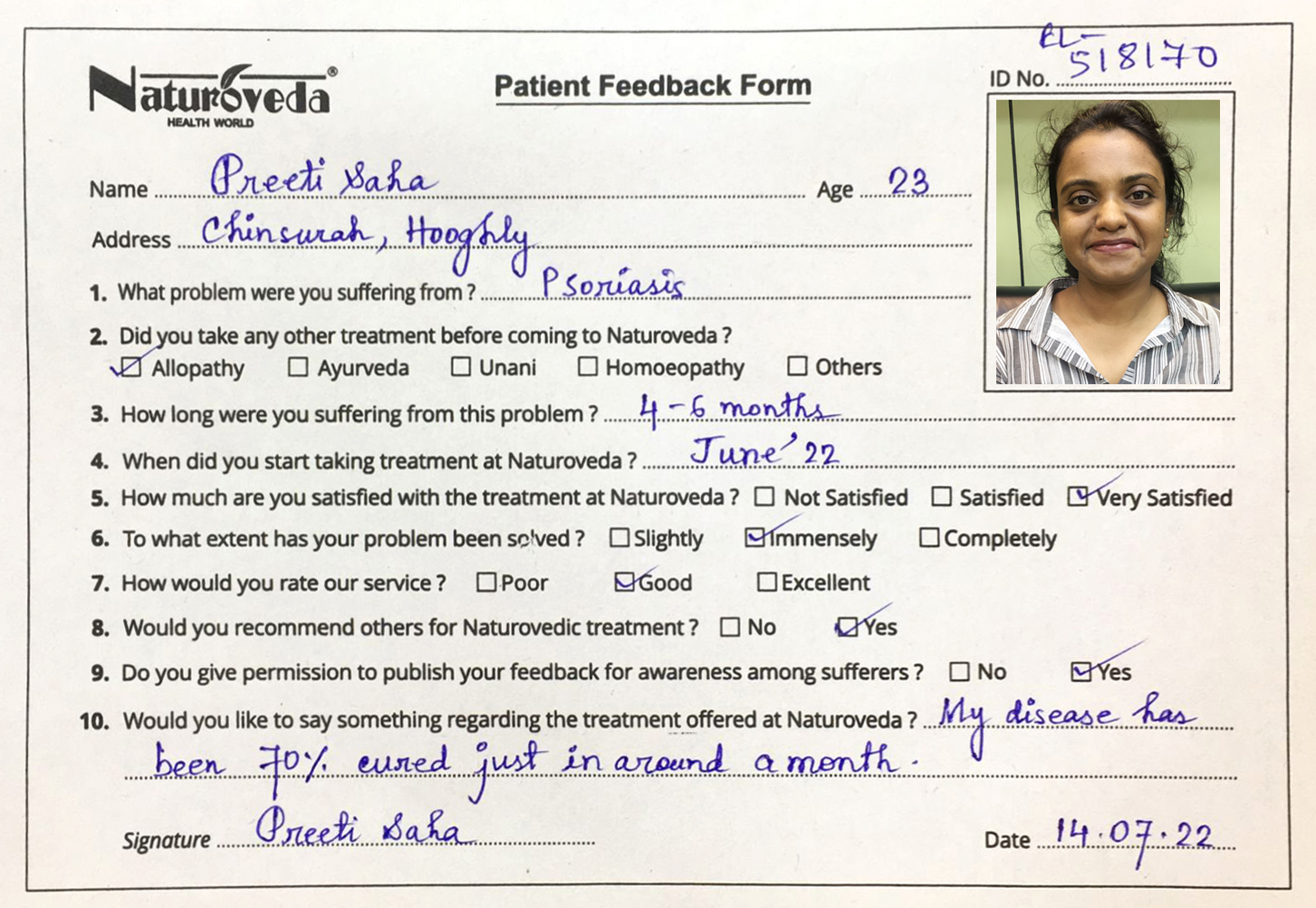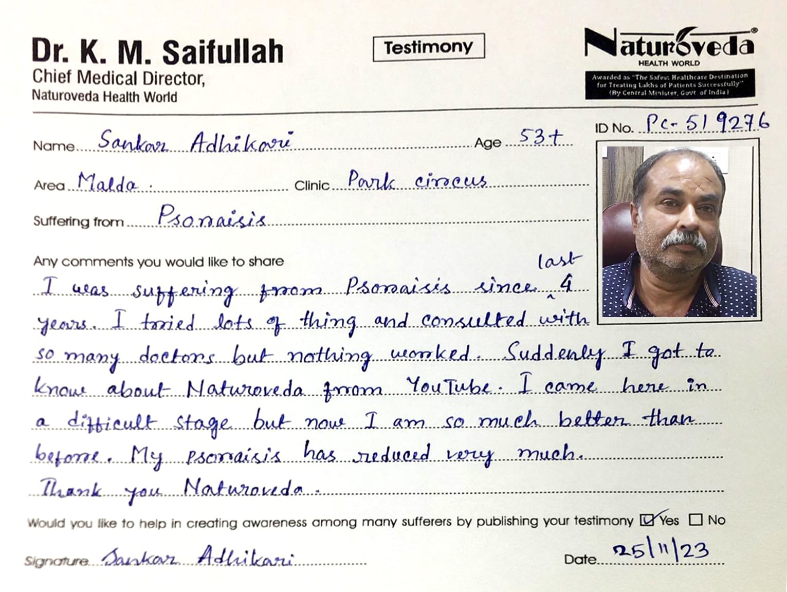 “ I was suffering from psoriasis since 2016. After taking treatment from Naturoveda, I am better than previous condition. Though still have some symptoms of psoriasis like itching, redness around the affected area, I am satisfied with the treatment of Naturoveda. “