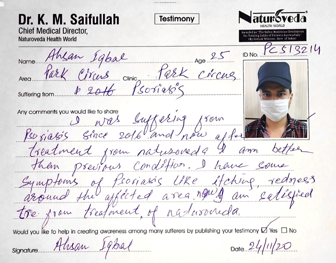 " I have been suffering from Psoriasis for 4-6 months. My problem has been recovered up to 70% within 1 month of treatment from Dr. K. M. Saifullah. "