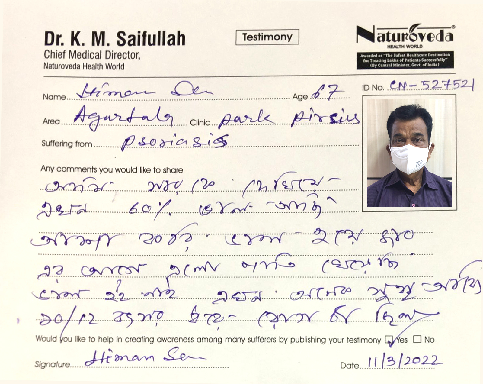 " I am up to 60% better after consulting Dr. K. M. Saifullah Sir. I hope that I will completely recover. Earlier, I took modern medicines, but without any results. Now I am feeling well. I have been suffering from Psoriasis for 10 years. "